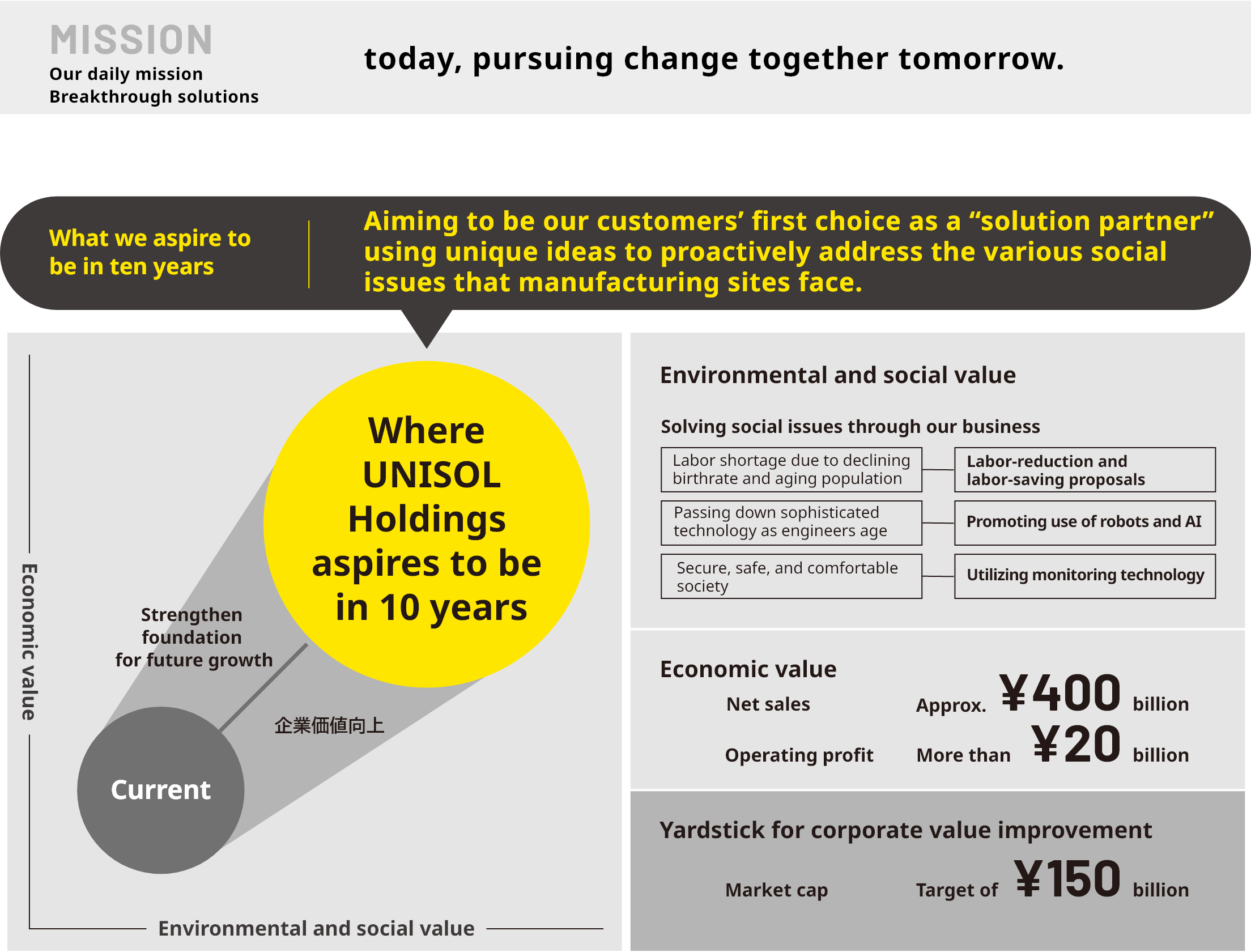 We have formulated a Medium-Term Management Plan and established a roadmap for the economic, social, and environmental value improvements that will allow us to move toward where we want to be in 10 years.