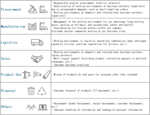 As a result, we identified “Management of the working environment for our employees” and “Consideration for foreign workers within our company” as priority themes. Moving forward, we plan to ensure and expand awareness of our existing initiatives while simultaneously conducting human rights impact assessments for these priority themes.